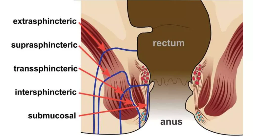 - ಪೆರಿಯಾನಲ್ ಫಿಸ್ಟುಲಾ – ಇದು ಚರ್ಮ ಮತ್ತು ಗುದದ ನಡುವೆ ಸಂಭವಿಸುವ ಅತ್ಯಂತ ಸಾಮಾನ್ಯ ವಿಧವಾಗಿದೆ.
