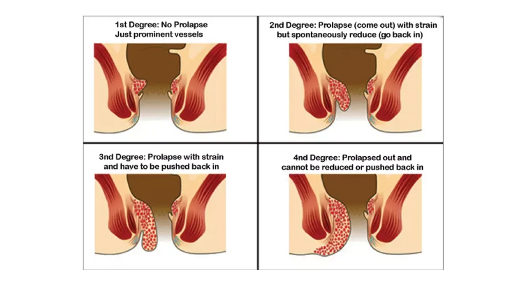 • ಪ್ರೋಲ್ಯಾಪ್ಸ್ಡ್ ಹೆಮೊರೊಯಿಡ್ಸ್ : ಆಂತರಿಕ ಮೂಲವ್ಯಾಧಿಗಳು ಊದಿಕೊಂಡಾಗ ಮತ್ತು ಗುದದ್ವಾರದ ಹೊರಗೆ ಉಬ್ಬಲು ಪ್ರಾರಂಭಿಸಿದಾಗ ಪ್ರೋಲ್ಯಾಪ್ಸ್ಡ್ ಹೆಮೊರೊಯಿಡ್ಸ್ ಬೆಳವಣಿಗೆಯಾಗುತ್ತದೆ. ಅವರು ತುರಿಕೆ, ನೋವು, ಅಸ್ವಸ್ಥತೆ ಮತ್ತು ಸುಡುವ ಸಂವೇದನೆಯನ್ನು ಉಂಟುಮಾಡಬಹುದು.